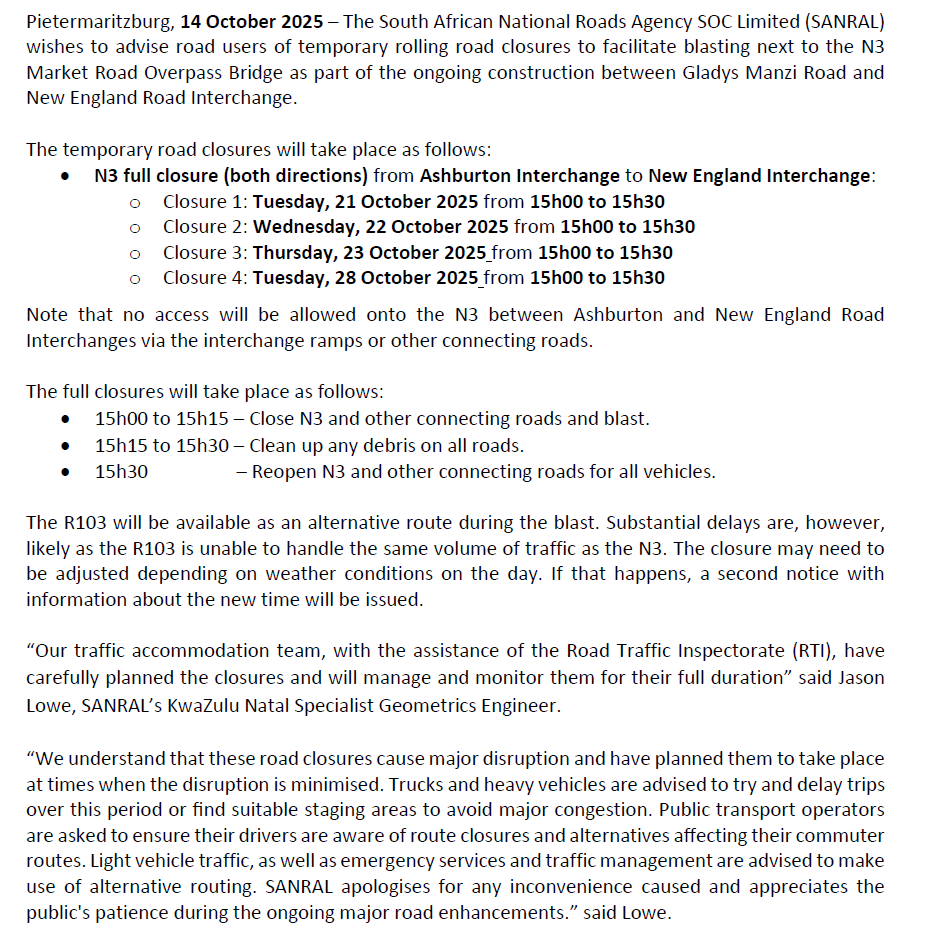 N3 FULL CLOSURES TO FACILITATE BLASTING ACTIVITIES BETWEEN NEW ENGLAND INTERCHANGE AND MARKET ROAD INTERCHANGE 15Oct2025FutshaneSauthor2092views0comments TRAFFIC ADVISORY N3 FULL CLOSURES TO FACILITATE BLASTING ACTIVITIES BETWEEN NEW ENGLAND INTERCHANGE AND MARKET ROAD INTERCHANGE