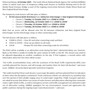 TRAFFIC ADVISORYN3 FULL CLOSURES TO FACILITATE BLASTING ACTIVITIES