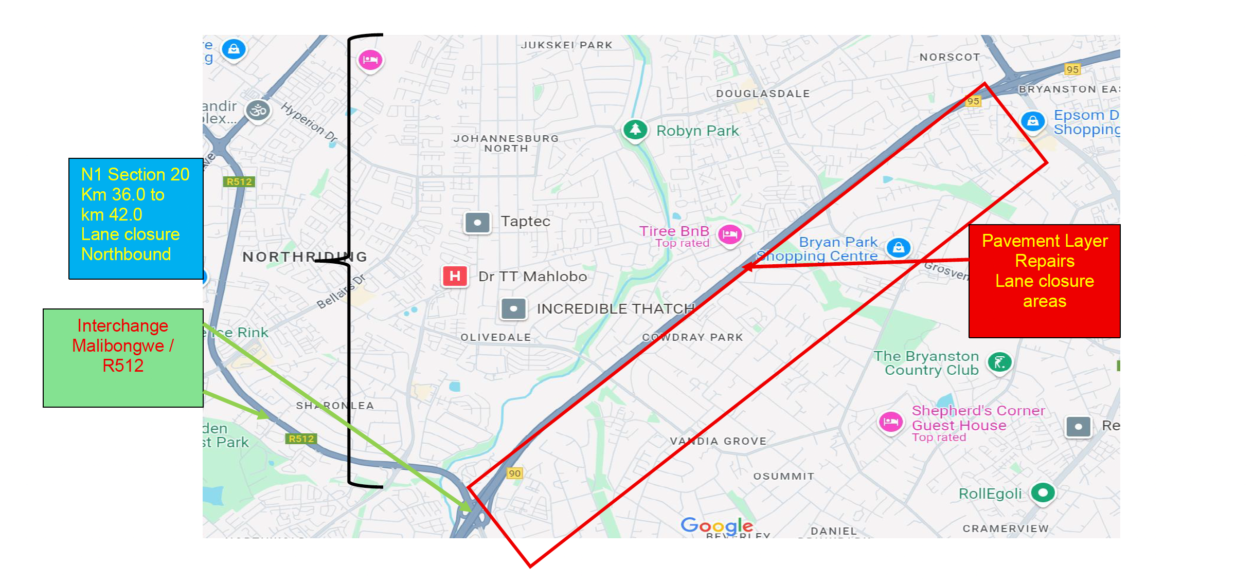 Gauteng, 4 July 2025- The South African National Roads Agency SOC Limited (SANRAL) would like to notify road users that pavement layer repairs will be done on the N1 national road section 20 at km 36.0 – km 42.0. The repairs will require shifting of traffic on the northbound carriageway (from Malibongwe Interchange to Winnie Mandela Interchange) from the two slow lanes to two fast lanes. The traffic shift is currently planned to occur from 9am to 3pm on the 5 July 2025 to 10 July 2025.
