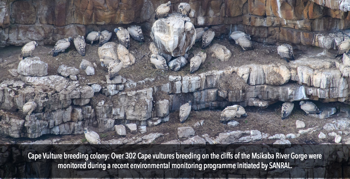 As part of the environmental requirements of the N2 Wild Coast Road (N2WCR) project, SANRAL recently conducted a vulture-monitoring programme to monitor the impact of the construction of the Msikaba and Mtentu Bridge haul roads on the Msikaba vulture colony.