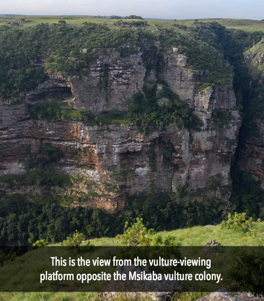 In 2015 the Cape Vulture, which is endemic to southern Africa, was listed as a regionally endangered species. The Msikaba vulture colony is one of the primary conservation priorities for Cape Vultures in the Eastern Cape, with approximately 170 to 190 pairs regularly nesting on the cliffs of the Msikaba River Gorge.