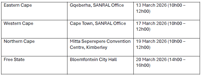 SANRAL will conduct more stakeholder engagement sessions this week at the following locations and dates: