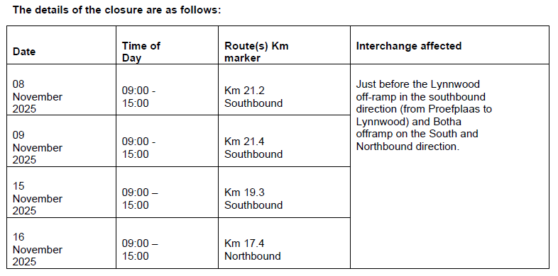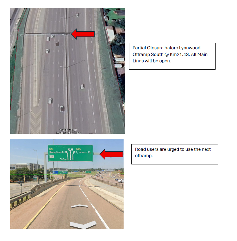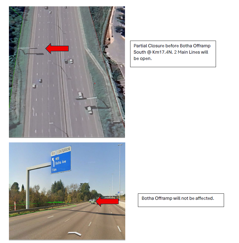 Gauteng 07 November 2025 – The South African National Roads Agency (SANRAL) wishes to inform road users of planned traffic disruptions on the N1 Section 21 Southbound due to the replacement of an overhead gantry sign.