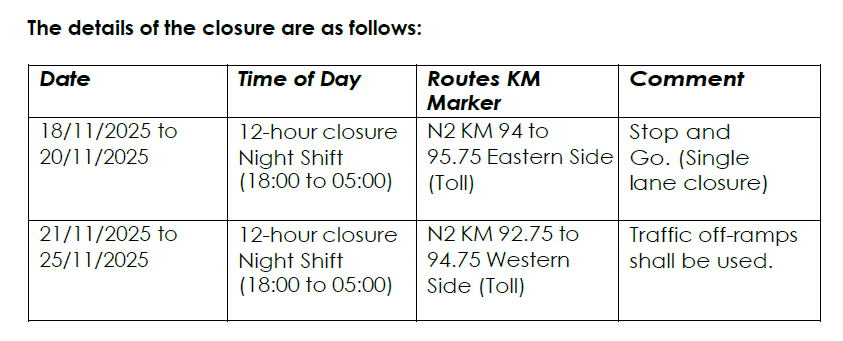 TEMPORARY LANE CLOSURES ON THE N2 FOR THE REMOVAL AND
