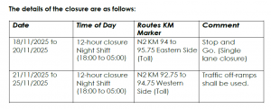 N3 FULL ROAD CLOSURE NEAR MARKET ROAD, PIETERMARITZBURG FOR THE DEMOLITION OF THE EXISTING N3 MARKET ROAD OVERPASS BRIDGE 5 months ago 0 43875