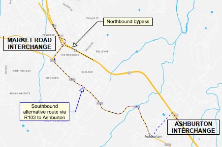 - N3 Southbound: Alternative via Market Road offramp, then left onto R103 to Ashburton, left onto Pope Ellis Drive and back onto the N3 via Ashburton Interchange