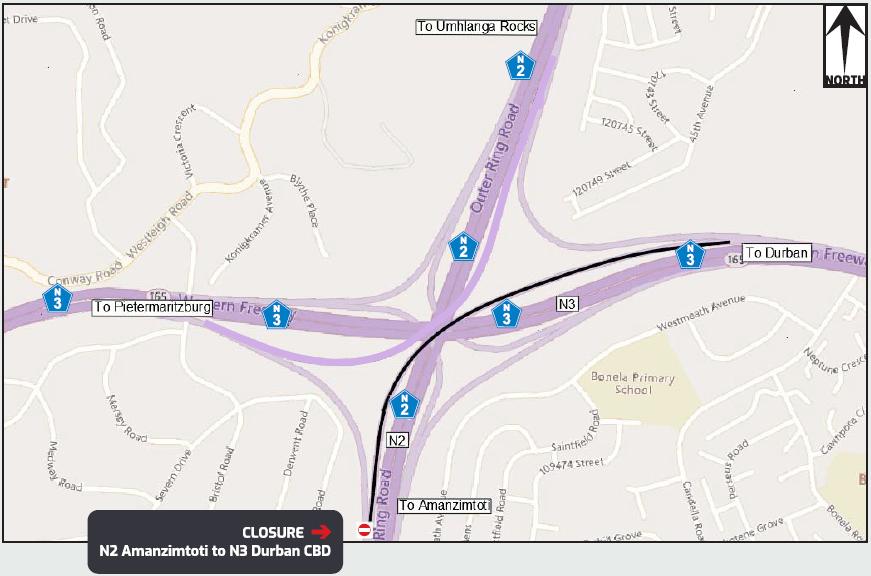 The following alternative route is provided for the closures affecting the N2 Northbound to N3 Eastbound (from Amanzimtoti to Durban CBD) as follows: