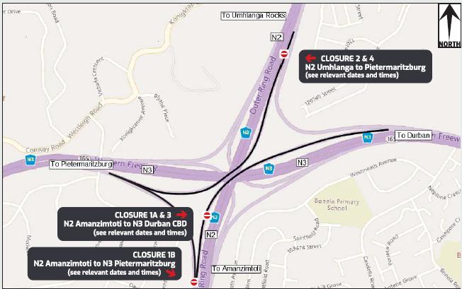 The following alternative route is provided for the closures affecting the N2 Northbound to N3 Eastbound (from Amanzimtoti to Durban CBD) as follows: