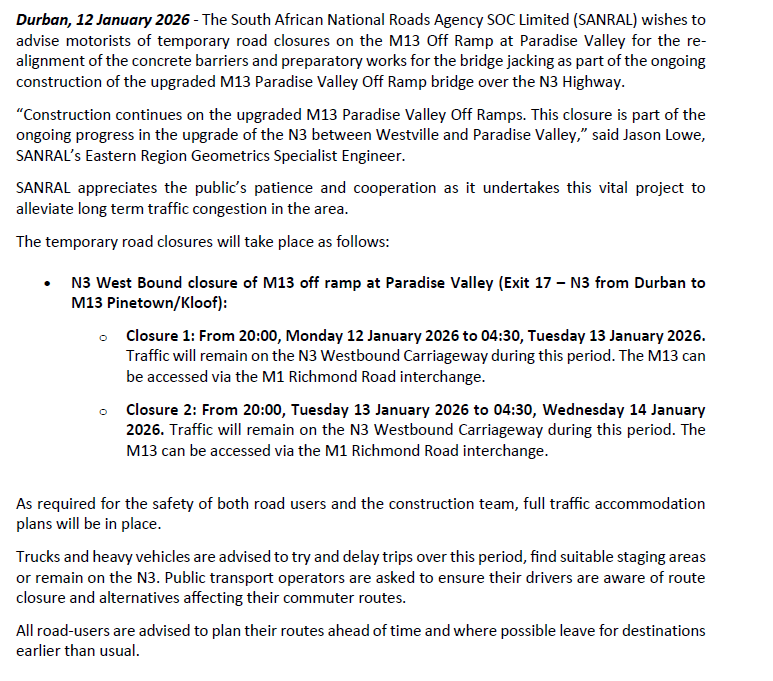 TEMPORARY ROAD CLOSURES ON M13 OFF RAMP AT PARADISE VALLEY FOR PREPARATION OF OVERPASS BRIDGE JACKING