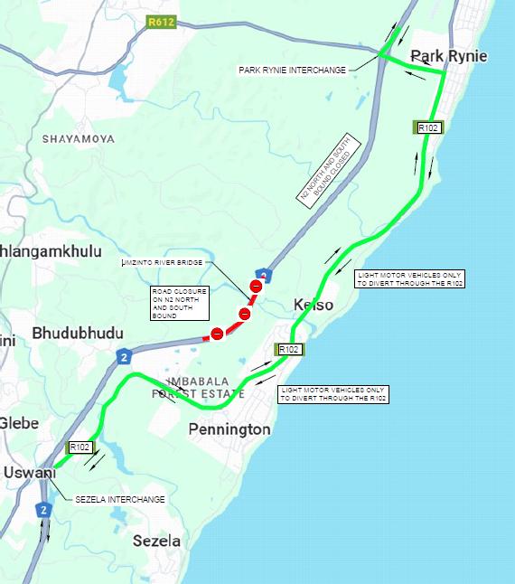 - R102 North and South bound: A detour will be in place at the Sezela and Park Rynie Interchanges for Light Motor Vehicles only, to join the R102.