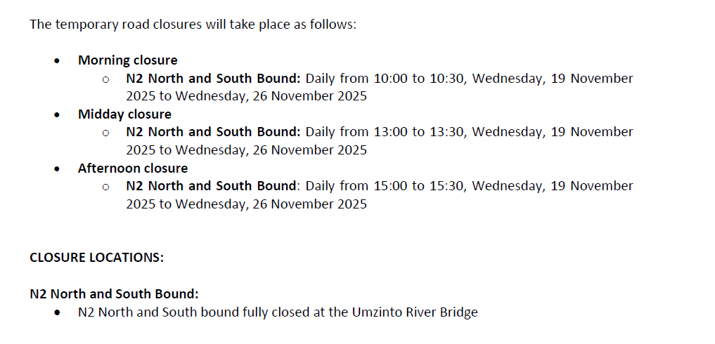Durban, 17 November 2025 – The South African National Roads Agency SOC Limited (SANRAL) announces temporary road closures on the N2 North and South bound between Sezela Interchange and Park Rynie Interchange for the commissioning of the South Coast Water Pipeline on the N2 Umzinto River Bridge from 19 November 2025 to 26 November 2025.