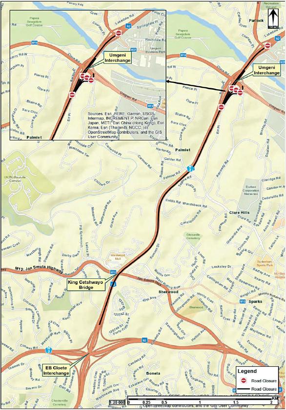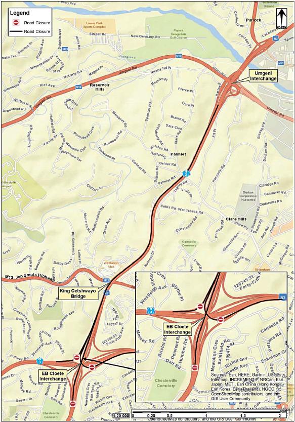 - N3 Eastbound Off Ramp (Pinetown to King Shaka International Airport) – Ramp closed to N2 North (to Umhlanga/King Shaka International Airport) – can only proceed to N2 South or N3 towards Durban.